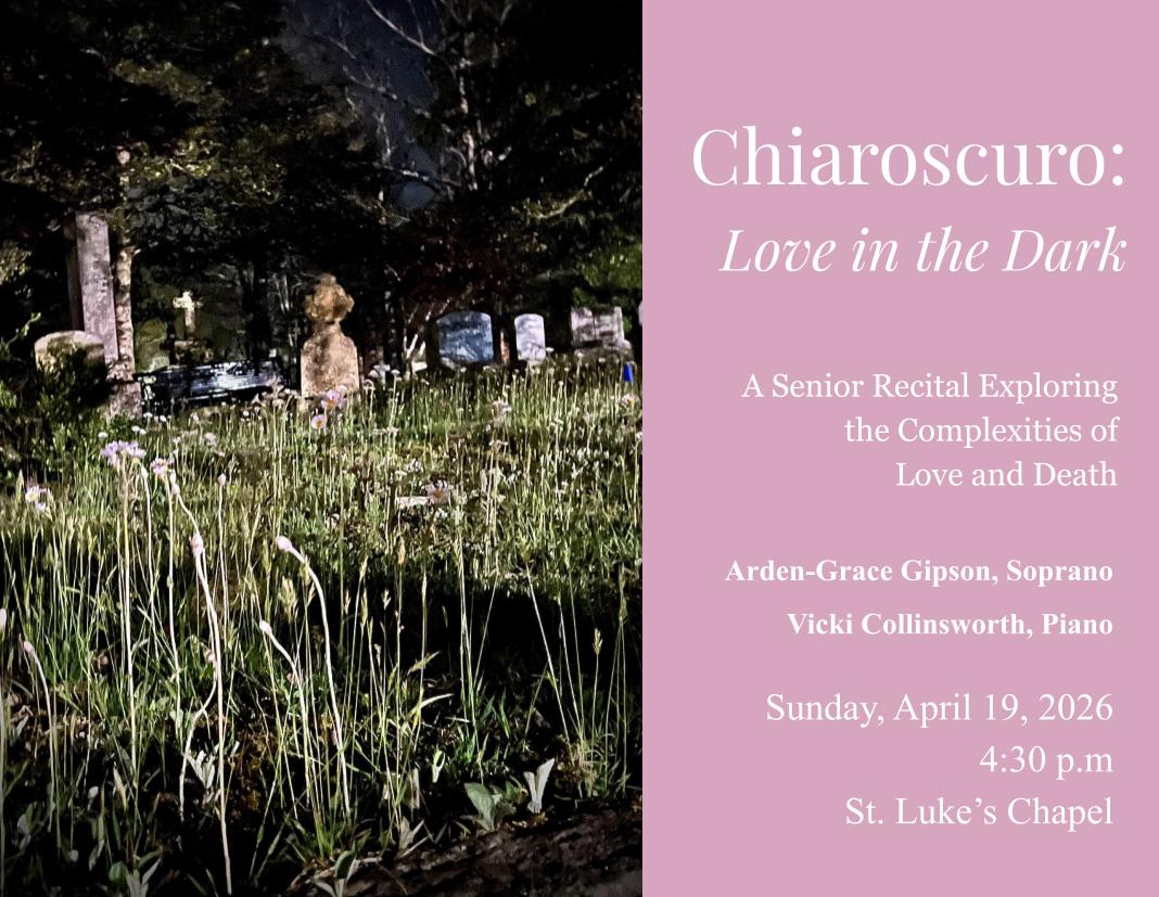 Join soprano Arden-Grace Gipson for Chiaroscuro: Love in the Dark, a senior recital exploring the complexities of love and death. With Vicki Collinsworth, piano.