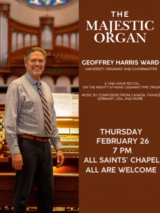 Experience the grandeur of the mighty 67- rank Casavant pipe organ as Geoffrey Harris Ward, University Organist and Choirmaster, brings the chapel to life.