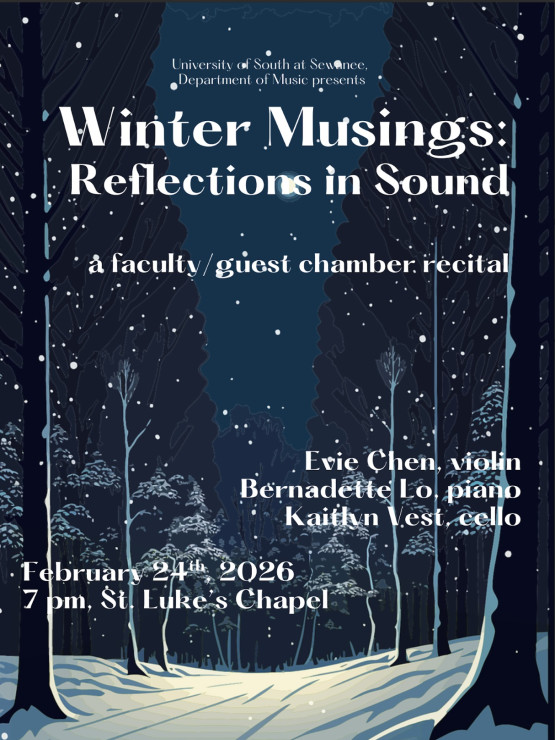 The University of the South Department of Music presents a faculty and guest artist chamber music recital featuring violinist Evie Chen, cellist Kaitlyn Vest, and pianist Bernadette Lo on Tuesday, February 24, at 7:00 p.m. in St. Luke’s Chapel.