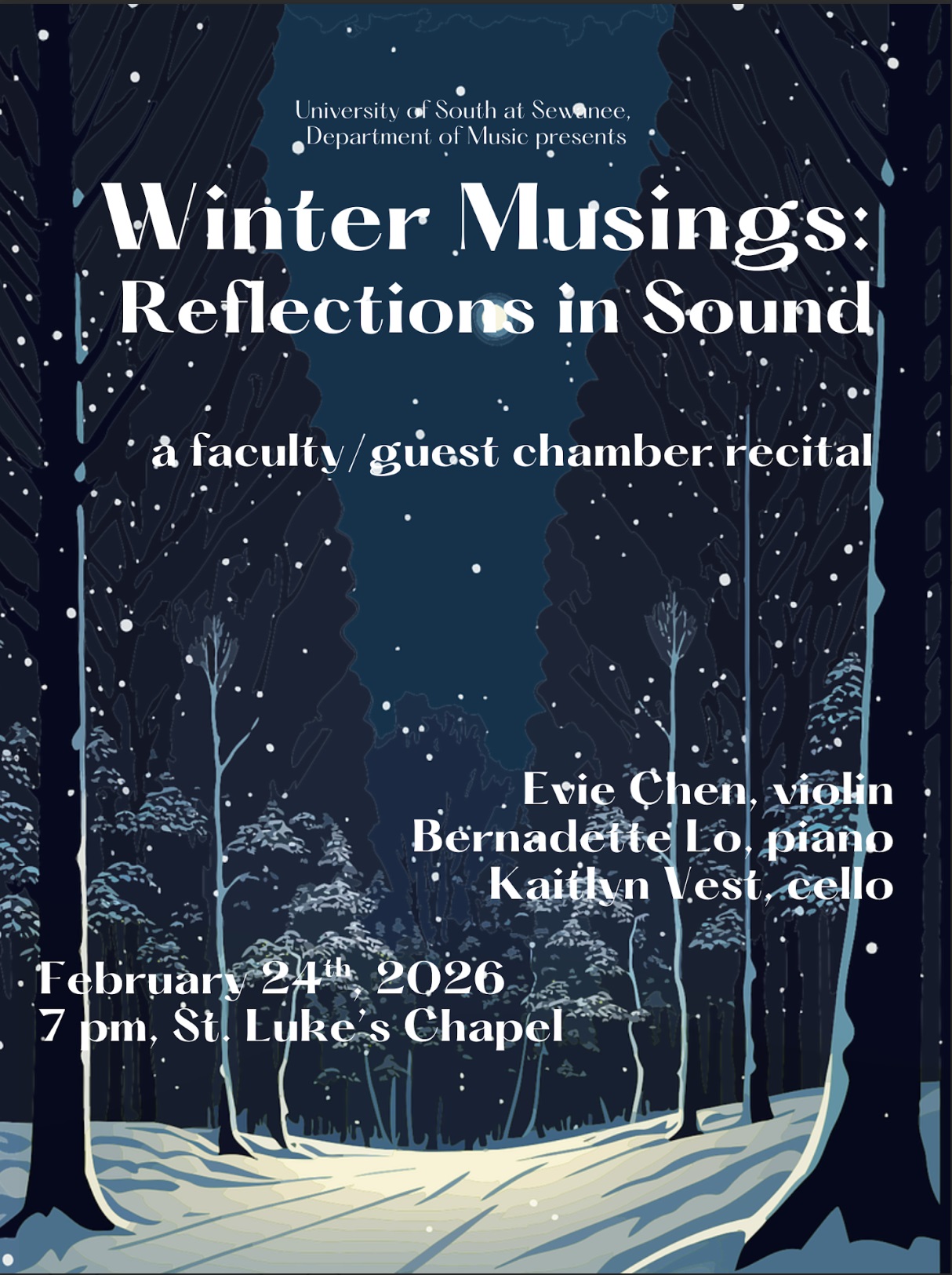 The University of the South Department of Music presents a faculty and guest artist chamber music recital featuring violinist Evie Chen, cellist Kaitlyn Vest, and pianist Bernadette Lo on Tuesday, February 24, at 7:00 p.m. in St. Luke’s Chapel.
