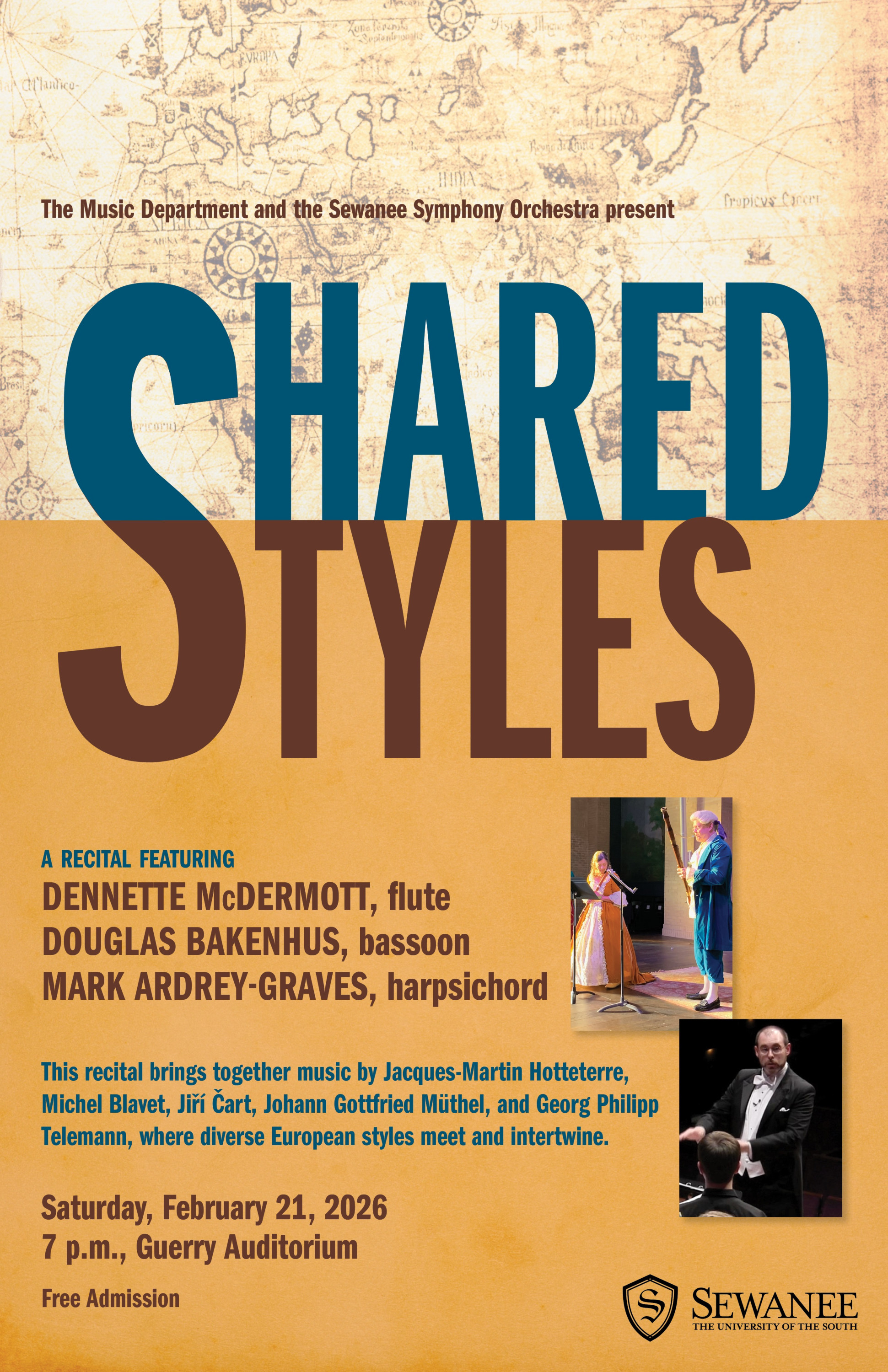 Shared Styles brings together guest artists Dennette McDermott, flute, and Douglas Bakenhus, bassoon, in collaboration with Mark Ardrey-Graves, harpsichord, Assistant Professor at the School of Theology. Performed on period instruments, the program explores the rich exchange of European musical traditions, highlighting how distinct national styles intersect and blend into a shared musical language shaped by travel, dialogue, and individual expression.