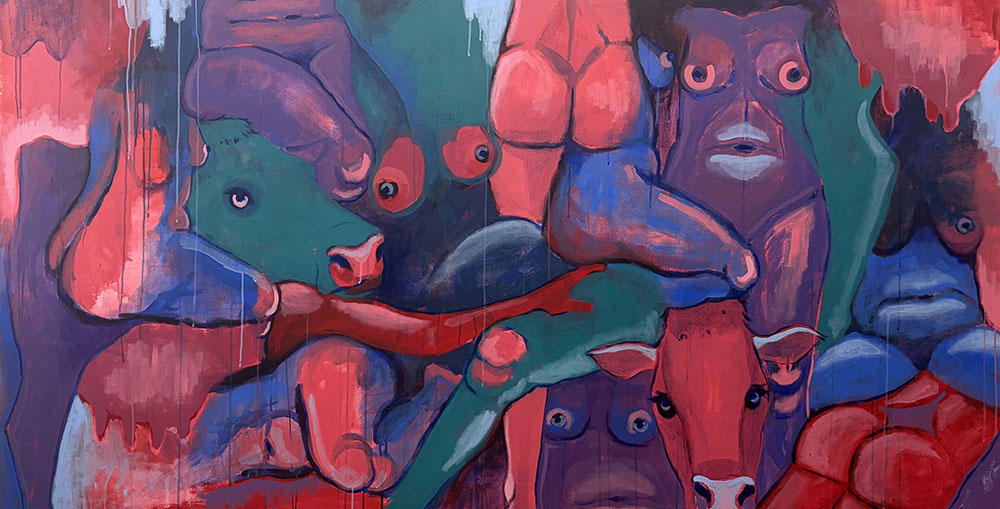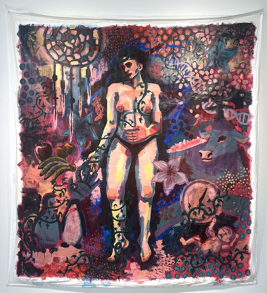 The Carlos Gallery in the Visual Art Building at the University of the South is pleased to present Fragments of Love and Pain, an exhibition by Sunny Bowers, C'26. Fragments of Love and Pain describes the sensory experience of being human as we relate and interact with our surroundings, other beings, and ourselves. This body of work begs people to understand their crucial role in creating a more loving and empathetic world, not only for oneself but also for others, through engaging in acts of empathy found within vulnerability. This work combines large-scale painting with improvised violin sound sculptures as well as drawing with violin and guitar music to create an immersive experience that expresses the overwhelming nature of being. The auditory pieces animate the narrative of my visual works making it performative and blur the separation of the reality we experience and the imaginary reality that exists within the work. The inclusion of nude female bodies, cows, intense color palettes, dripping paint, and unstructured sound sculptures create friction between beauty and discomfort. Fragments of Love and Pain examines anxiety, grief, existentialism, power dynamics, and the female body, inviting the audience to consider what is valuable about being human and reflect on how to bring more empathy to a world where it is lacking. Sunny Bowers combines visual art and music to consider what is valuable about being human and speak to themes of empathy, uncertainty, and existentialism. Bowers was born and raised in Annapolis, Maryland and is a student at The University of the South in Sewanee, Tennessee pursuing a BA in both Art and Music. Her work has been featured in Sticks Magazine as well as exhibited in the Carlos Gallery and the EQB Building at The University of the South. While at Sewanee she has worked as a Summer Undergraduate Research Fellow and as a freelance graphic designer. Bowers is also a classically trained violinist.