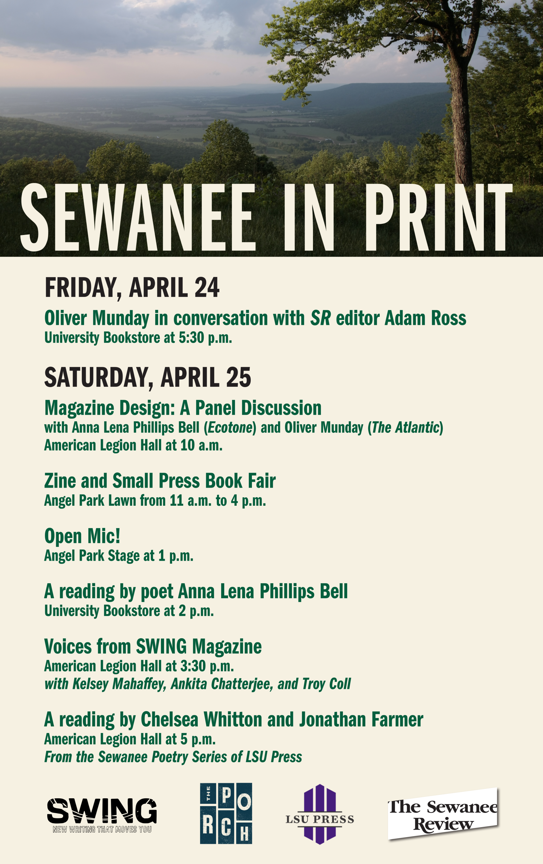 A celebration of print culture on the Cumberland Plateau and beyond, featuring author readings from the Sewanee Review, SWING, and the book series, Sewanee Poetry, as well as a panel on magazine design, an open mic, receptions galore, and the Zine & Small Press Book Fest.