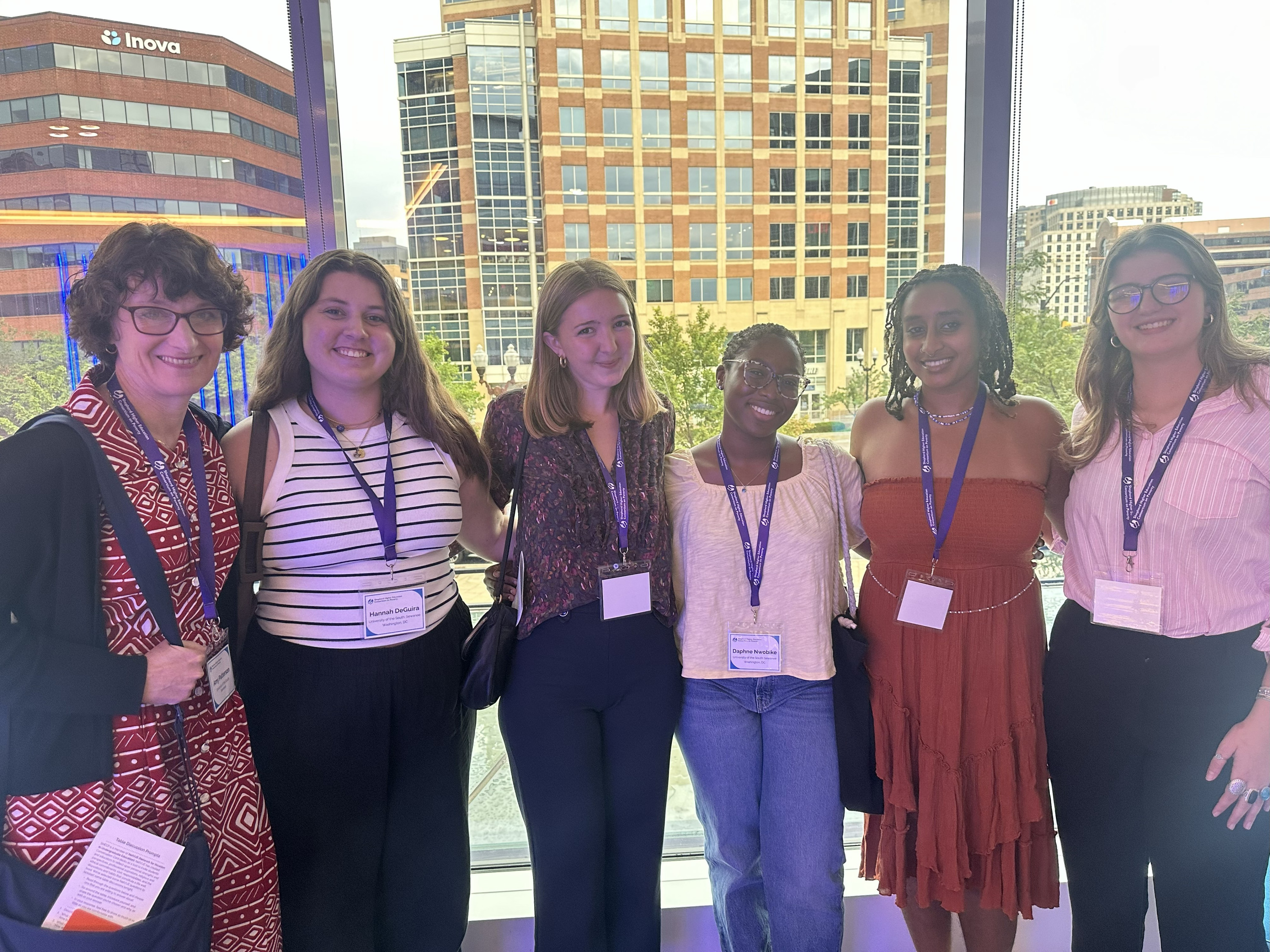 Dr. Amy Patterson, Hannah DeGuira (C’26), Olivia Moellering Baratas (C’27), Daphne Nwobike (C’26), Eleora Ephrem (C’26), and Victoria Quintero (C’26)