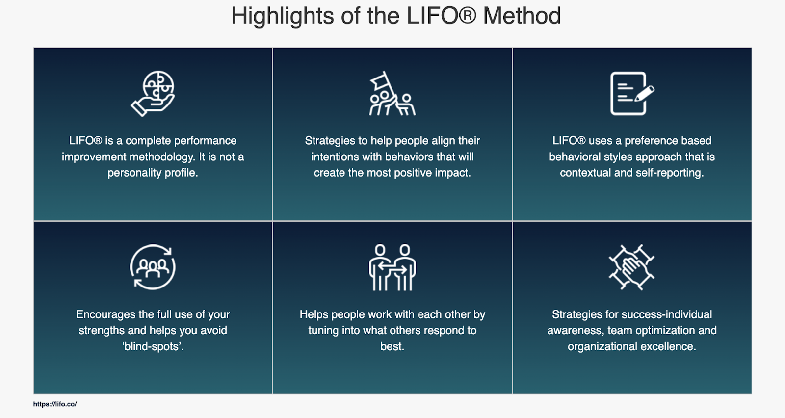 The LIFO assessment (free to participants) provides practical techniques to help you adjust your communication style, build trust, and improve collaboration, ensuring positive results in your work and relationships. It uniquely focuses on understanding and adapting natural behavioral preferences without rigid labels, making it flexible and practical. It offers actionable insights to improve communication and collaboration, helping individuals and teams work more effectively.