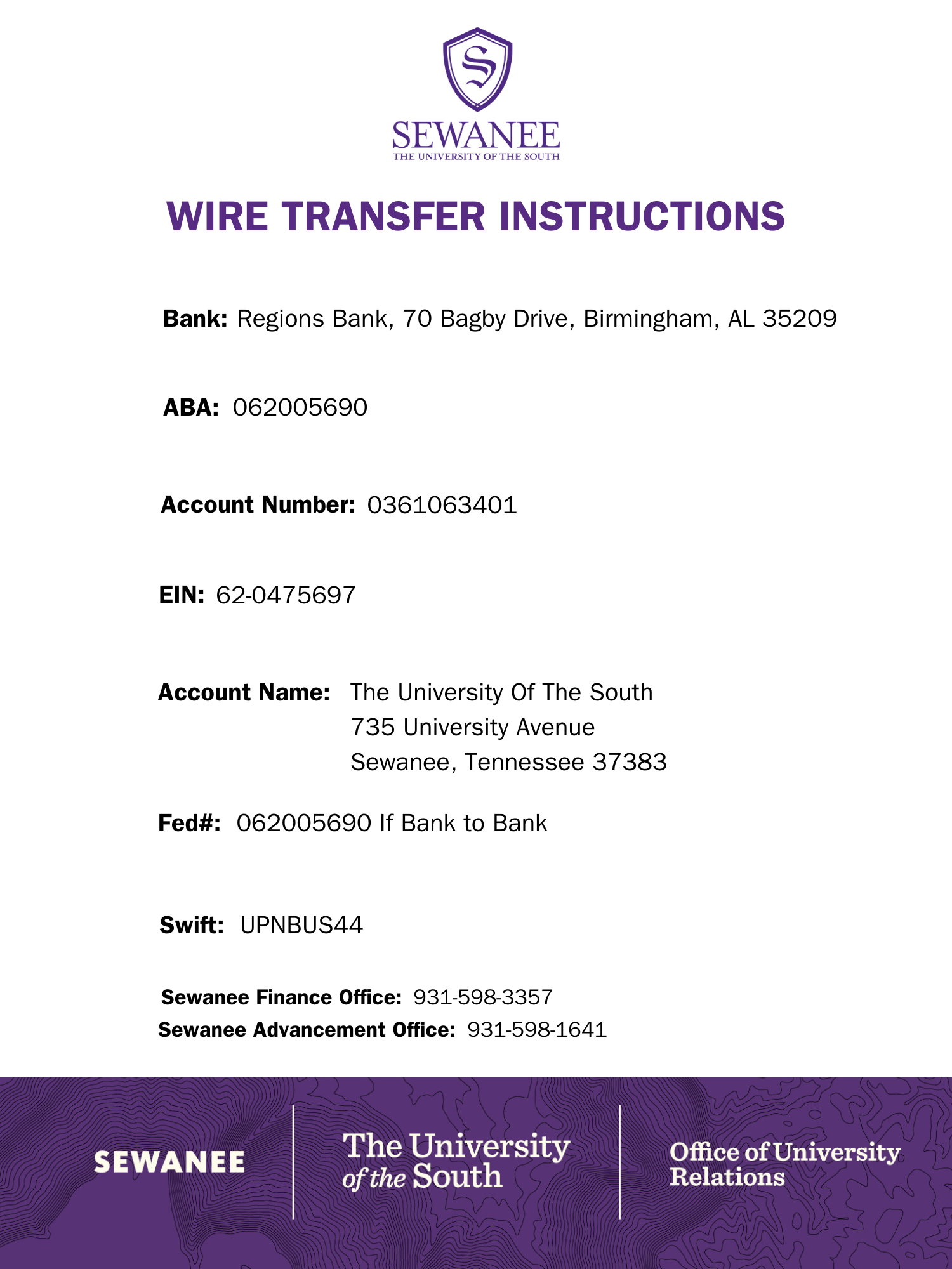 Click the link below to find information for making a gift via a wire transfer. To ensure an efficient process, please notify gifts@sewanee.edu before initiating your transfer.