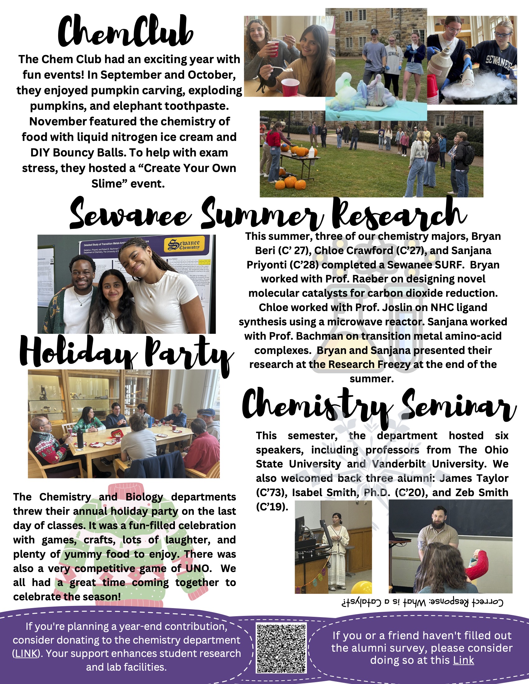 The chemistry department is proud of alumna Isabel Smith C’2020 who just published her first research paper in the Environmental Research Letters (Link). Isabel is working towards her PhD in Earth Sciences at the University of Southern California. She presented her current work to the Sewanee Chemistry Department last Fall (2023).