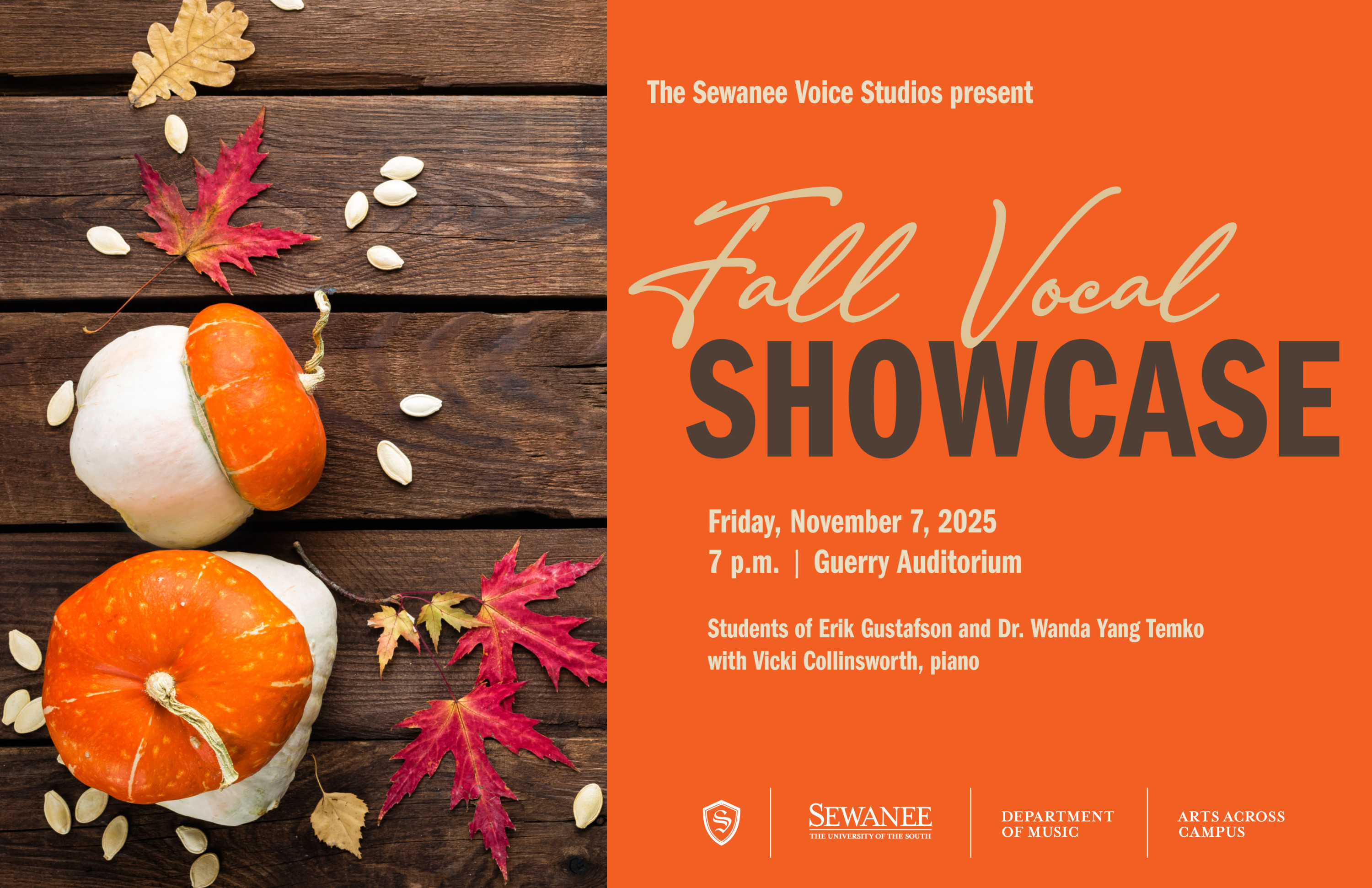 Join the Sewanee Voice Studios for our Fall Vocal Showcase, Friday, November 7 at 7:00 in Guerry Auditorium! In this semi-annual performance, Sewanee singers offer an engaging mix of musical theatre, art song, pop, rock, soul, and jazz.