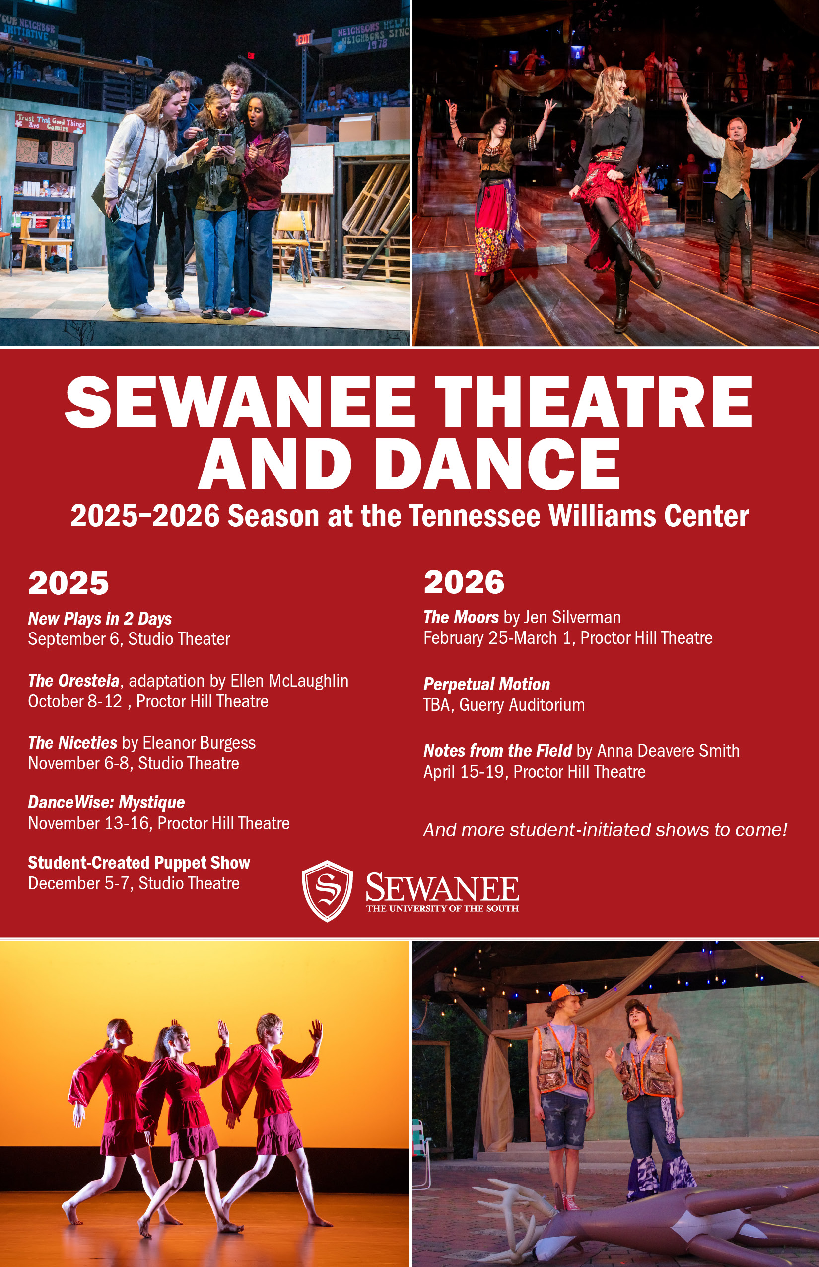 Theatre at Sewanee gives students the opportunity to engage in a dynamic liberal arts education while offering the personalized attention of an arts conservatory. We seek to create a supportive, inclusive environment where all voices are heard and thrive, where students gain confidence in their public speaking. Auditions and classes are open to everyone.