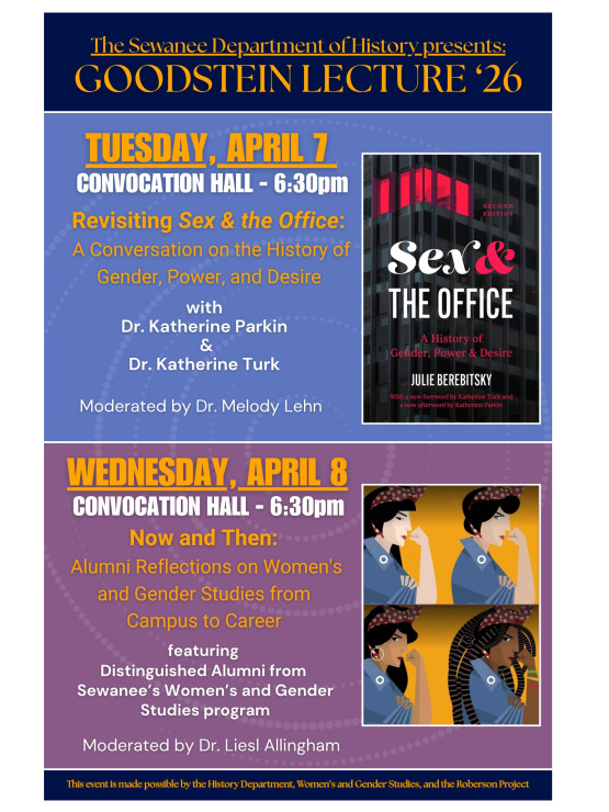 On April 7, Sewanee is proud to welcome Dr. Katherine Parkin, Professor and Jules Plangere, Jr. Endowed Chair in American Social History at Monmouth University, and Dr. Katherine Turk, Professor and Adjunct Associate Professor of Women’s and Gender Studies at the University of North Carolina, Chapel Hill, to campus as the 2026 Anita S. Goodstein Lecturers in Women's History.