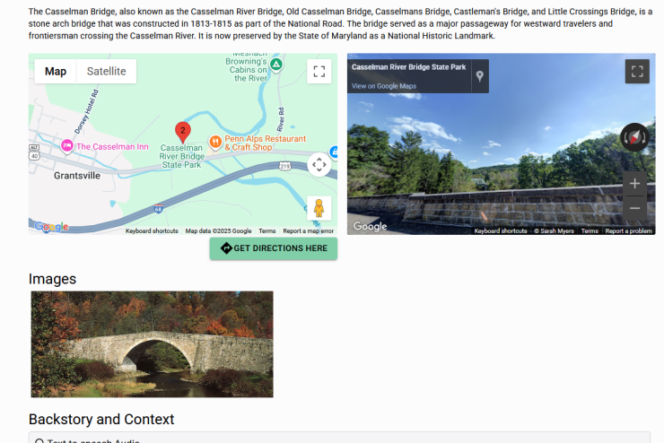 A Virtual Tour guides users though a simulation of real world locations created by images, videos, and other multimedia elements. Tours highlight the individual locations of your topic and communicate the distance between locations. The ability to upload multimedia content allows for comparison between what a location looks like in the present versus the time period of the topic.