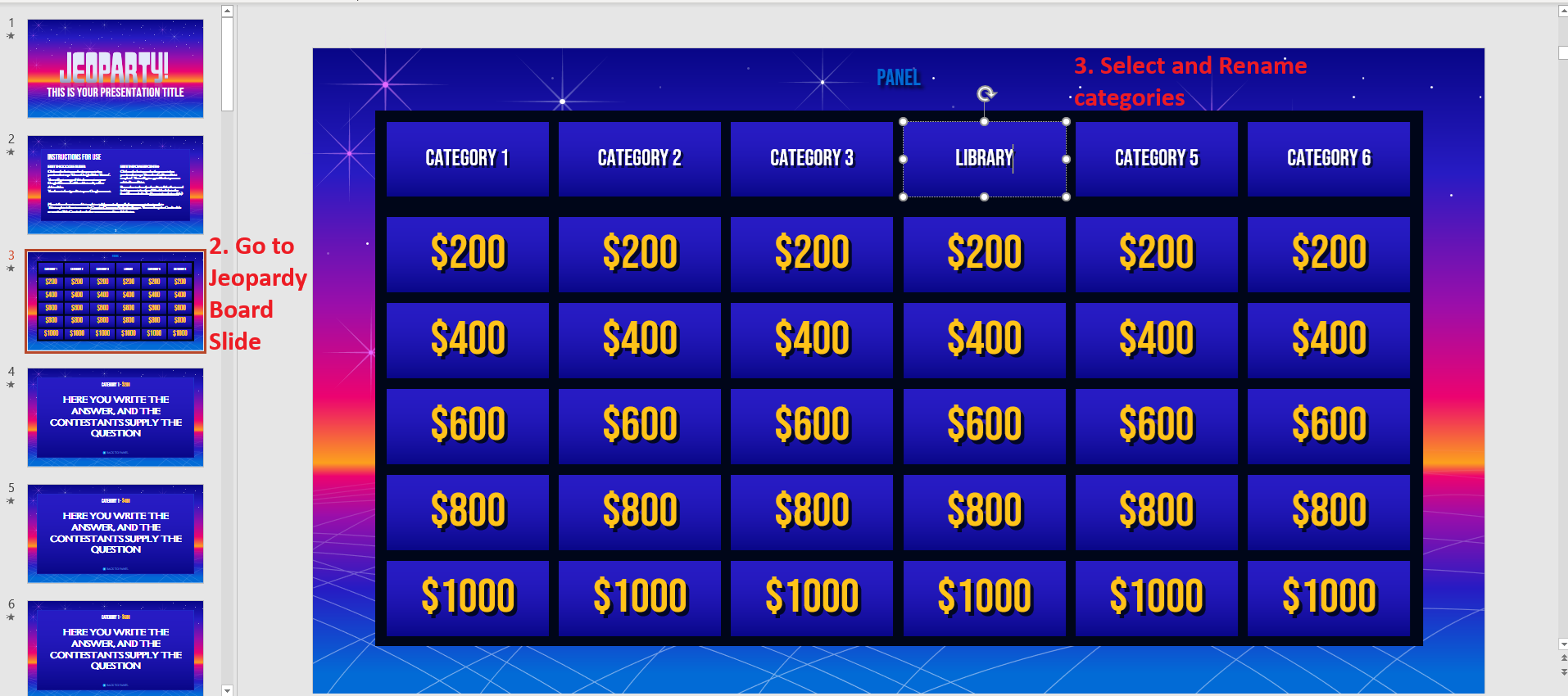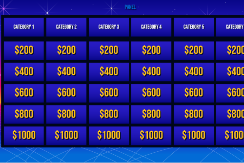 To create a Jeopardy style review game the University suggest using the Jeopardy slide template from Slides Carnival. Below you will find information on what can be added to the Jeopardy template, instructions on how to download, create, and run a game.